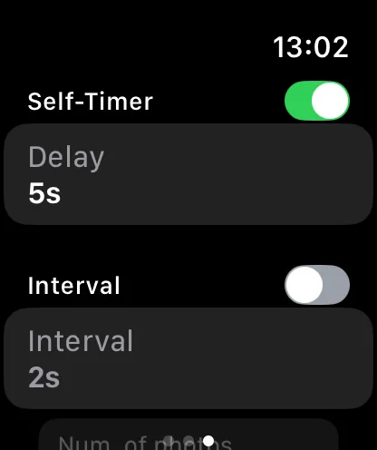 - Intervalometer — enable, set the interval, and set the number of photos