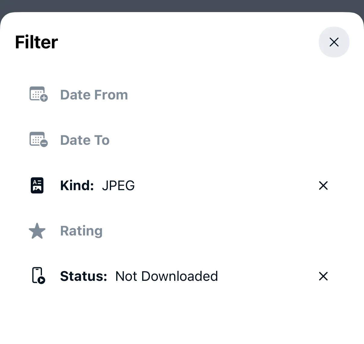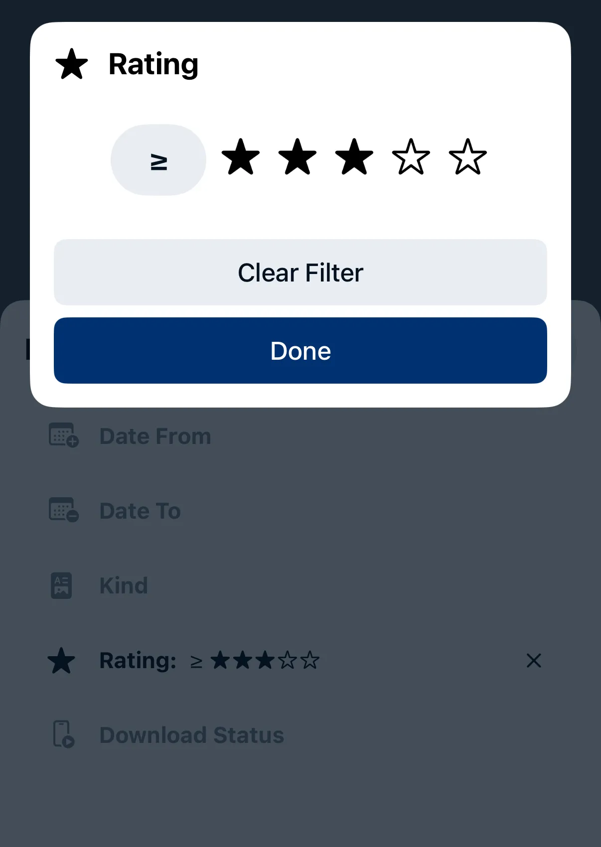Tap on the ≥ / ≤ / = symbol to rotate between images with at least X rating (≥), at most X rating (≤), or exactly X rating (=). Drag on the stars selector to select between 0 and 5 stars. Tap Clear Filter to remove rating filter.