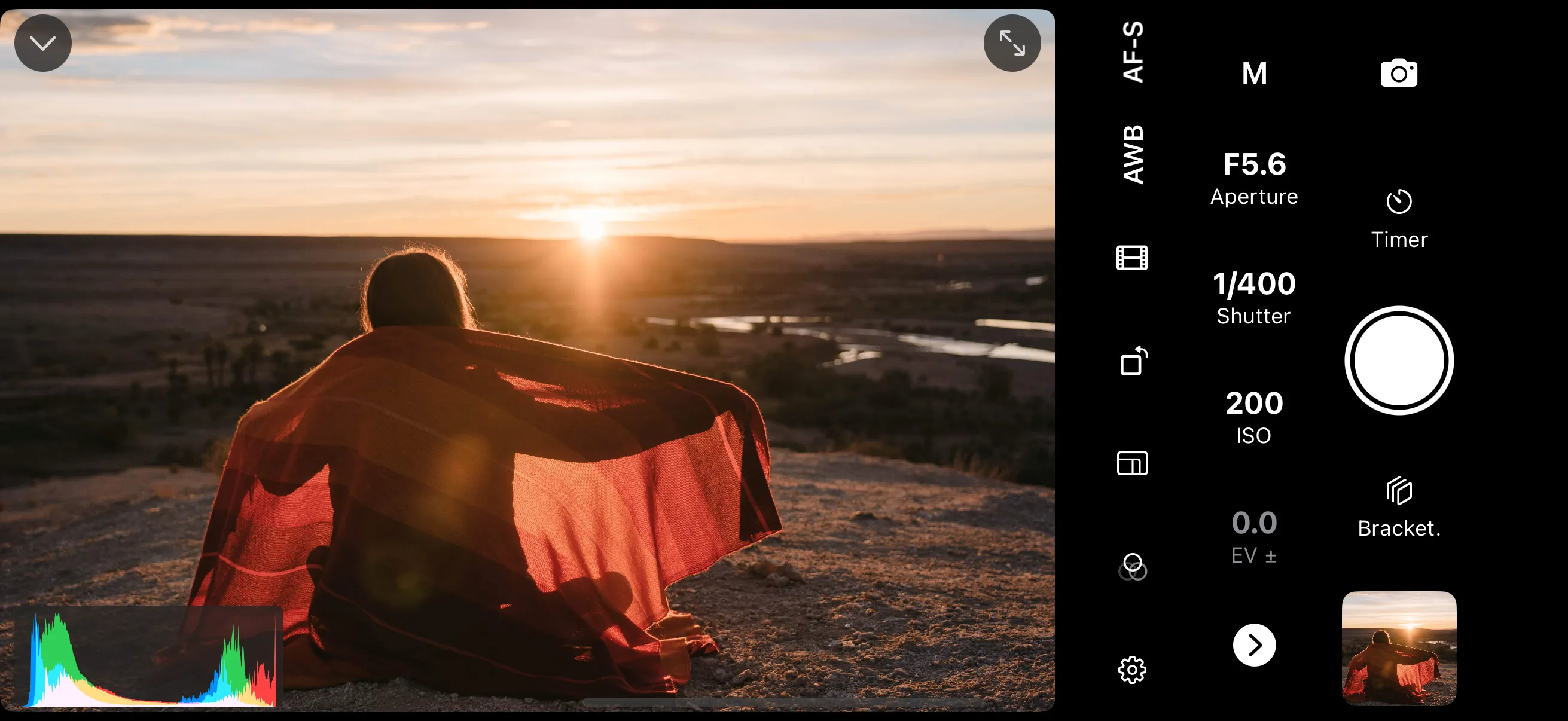 The histogram works independently of color effects — it stays visible whether you’re using zebra stripes, false color, LUT preview, or none of them.