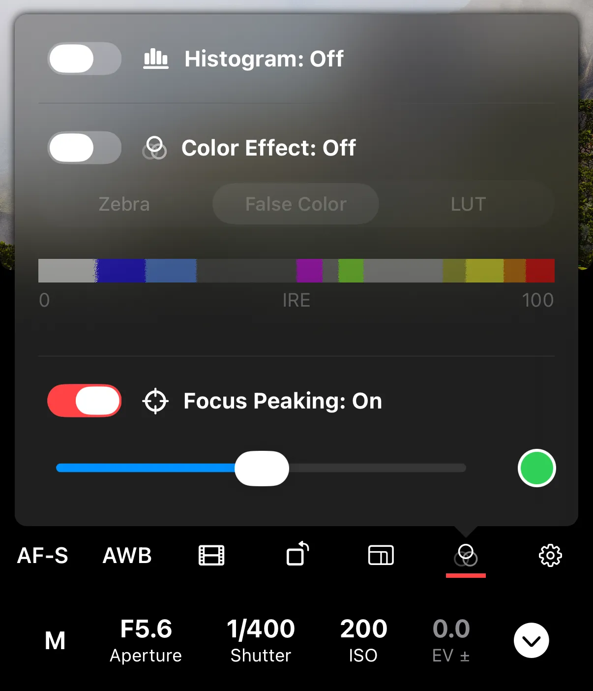 Color — tap on the color to choose between Green, Red, or White. Pick a color that contrasts with your subject so the peaking is easy to see. The default is green.