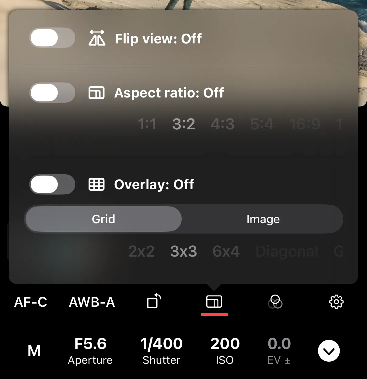 Mirror view flips the live view feed horizontally. This is useful when you’re standing in front of the camera — the mirrored preview feels more natural, like looking in a mirror.
