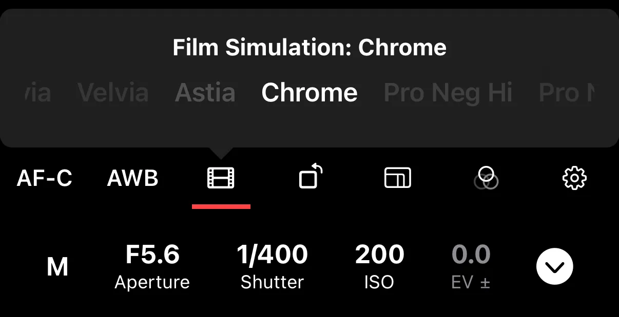 Tap the film simulation icon in the additional controls row to select a different profile. Which simulations are available depends on your Fujifilm camera model.